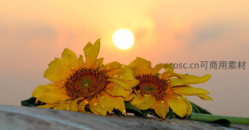 两朵向日葵静静躺在木板上,花瓣上沾满晶莹露珠,背景是柔和的金色夕阳,画面宁静而富有诗意。