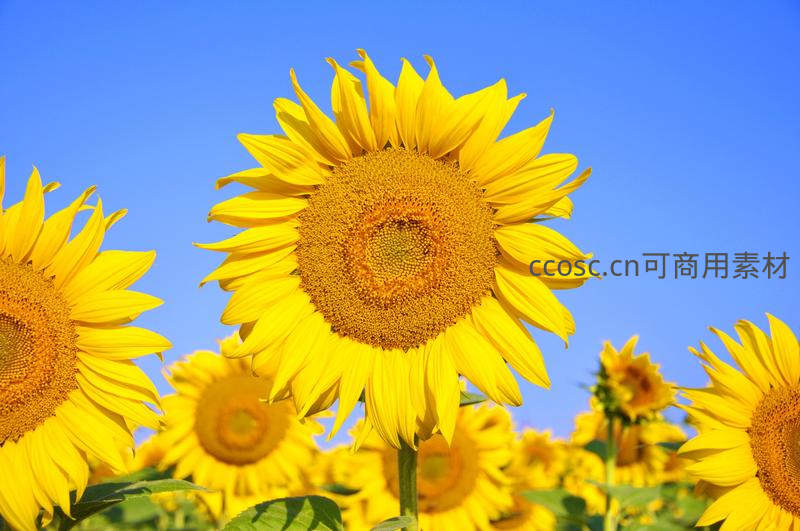 在万里无云的蔚蓝天空下,多株向日葵迎着阳光绽放,金黄色的花盘如同灿烂的笑脸,传递着积极向上的能量。