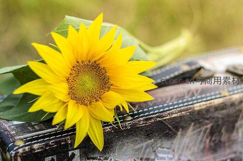一朵盛开的向日葵轻放在一个充满岁月痕迹的复古行李箱上,背景是柔和的绿色光斑,象征着旅途与自然的温柔邂逅。