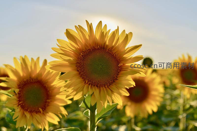 在温暖的夕阳下,一片向日葵花海沐浴在金色光芒中,前景花朵清晰,背景虚化,营造出宁静而浪漫的田园氛围。