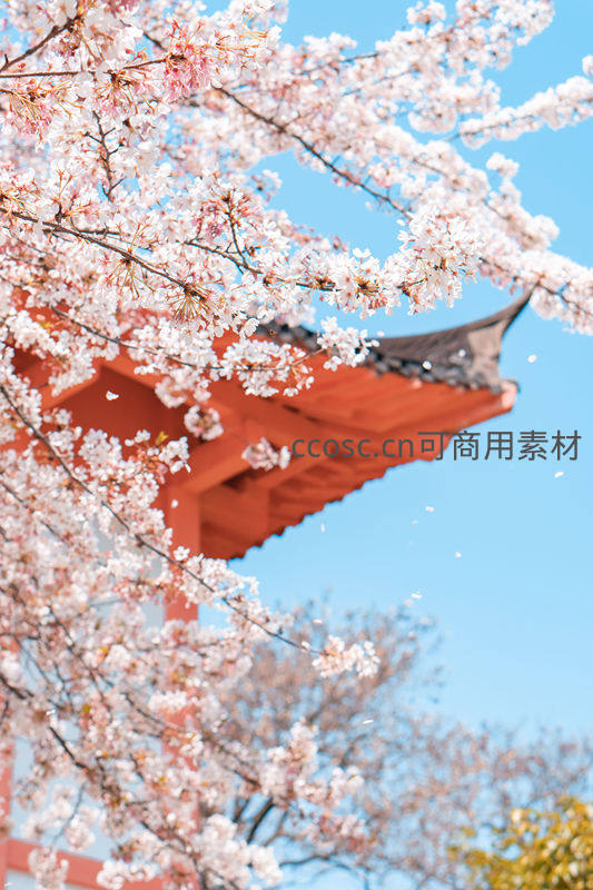 粉白樱花在古朴的红色寺庙飞檐前纷纷扬扬飘落,蓝天为幕,将自然之美与东方古典建筑巧妙融合,意境悠远宁静。