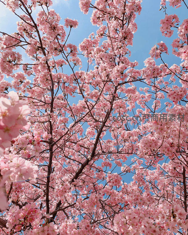 从下往上仰望,整片粉红色的樱花如云霞般铺满天空,在湛蓝背景的映衬下显得格外壮丽绚烂。