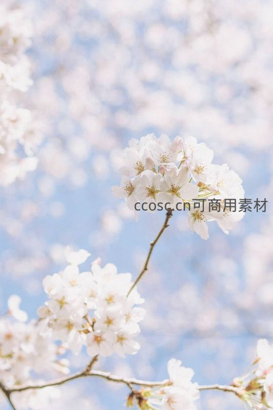 一枝洁白的樱花在淡蓝色天空背景下静静绽放,背景虚化形成梦幻光斑,尽显清雅与宁静之美。
