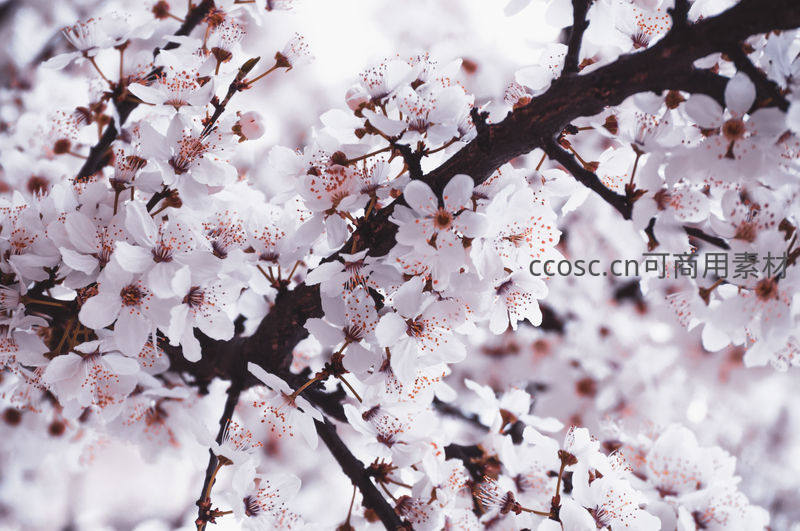 近观樱花蕊心,洁白花瓣点缀橙红花蕊如星点