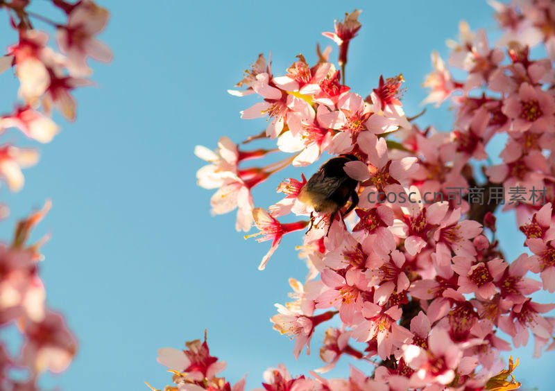 一只勤劳的蜜蜂正在粉红色樱花丛中采集花蜜,蓝天为背景,生动展现春天万物复苏的活力。