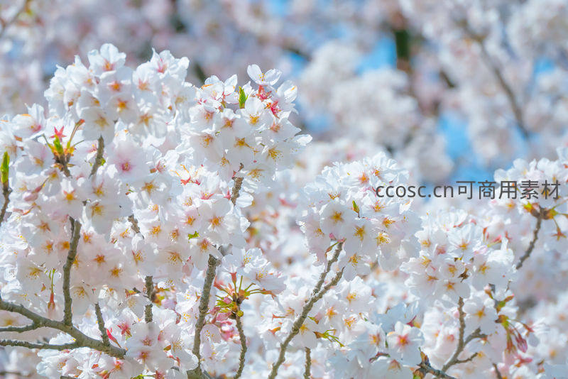 阳光下盛开的白色樱花,花瓣层层叠叠,背景是湛蓝天空,展现春天生机勃勃的自然之美。