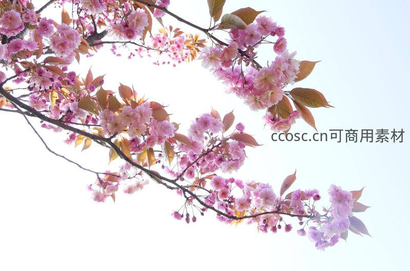 低角度仰拍粉红色樱花枝条,花朵与嫩叶交织,在明亮天空背景下显得格外温柔浪漫。