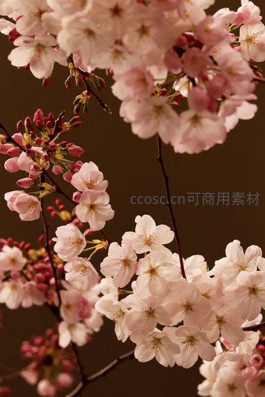 在温暖光线照射下,浅粉色樱花绽放,花蕊清晰可见,背景深褐衬托出花朵的柔美与宁静。