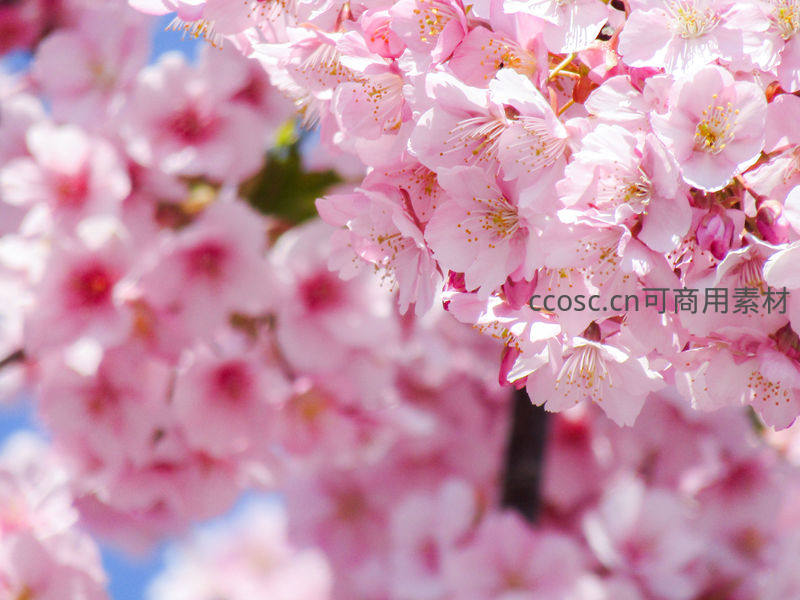 在明媚阳光的照耀下,一簇簇粉嫩的樱花竞相绽放,细腻的花瓣与金黄的花蕊交相辉映,充满生命力。