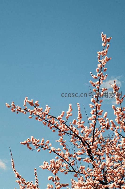 几枝稀疏的浅粉色桃花伸向纯净的蓝色天空,构图简洁而富有诗意,展现了早春时节枝头初绽的清雅与宁静,充满东方美学意境。