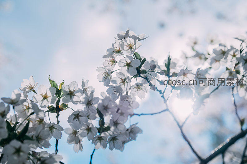 阳光从花朵后方穿透,将洁白的樱花花瓣照得晶莹剔透,细腻的纹理和花蕊清晰可见,背景是朦胧的蓝天,清新脱俗。