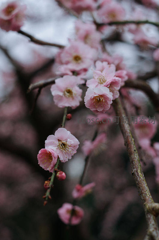 几朵淡粉色的梅花在湿润的枝条上静静绽放,背景虚化,突显花朵的娇嫩与清雅,仿佛能嗅到雨后空气中的淡淡花香。