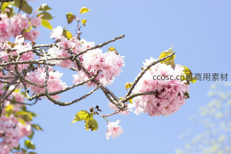 饱满的重瓣粉樱在明媚阳光下绽放,点缀着初生的嫩绿叶片,色彩鲜明,充满生机勃勃的春日气息。