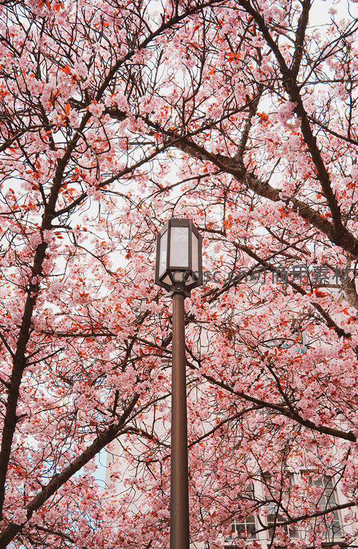路灯映衬樱花树,城市春景