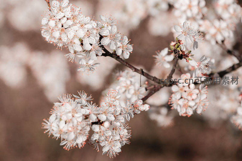 洁白的花朵在微距镜头下清晰可见,花蕊纤细精致,背景虚化柔和,突显花瓣的纯净与春日的温柔气息。