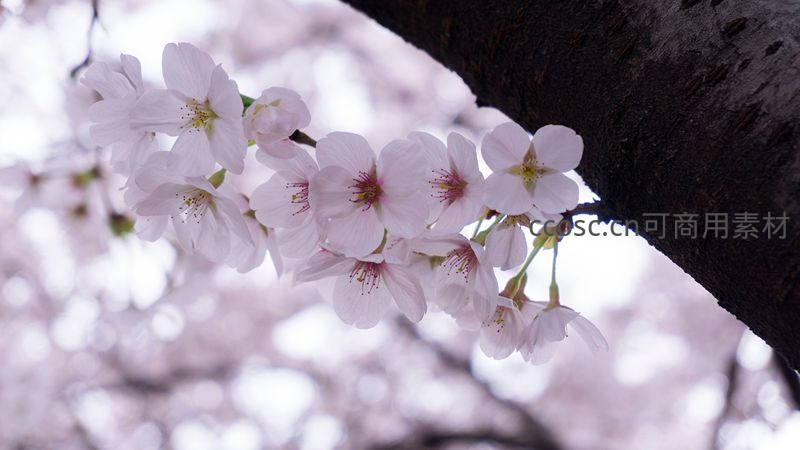 几朵洁白的樱花从粗壮的枝干旁低垂而下,背景虚化成柔和光斑,营造出一种静谧、诗意的春日意境。