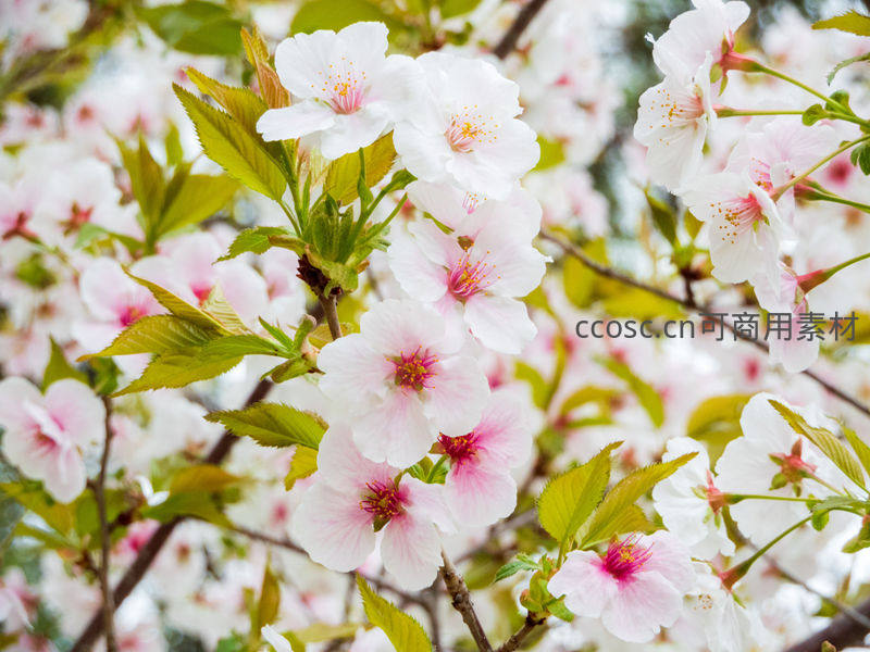 洁白带粉的樱花与鲜嫩的绿叶交相辉映,枝头绽放着生命的活力,完美诠释了春天万物复苏的蓬勃景象。