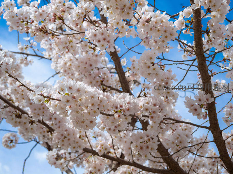 蓝天之下樱花盛放,洁白如雪缀满枝头