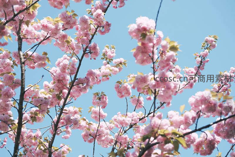 晴朗的蓝天之下,满树粉嫩的樱花竞相绽放,繁花似锦,与澄澈天空形成鲜明对比,充满春日的活力与浪漫气息。