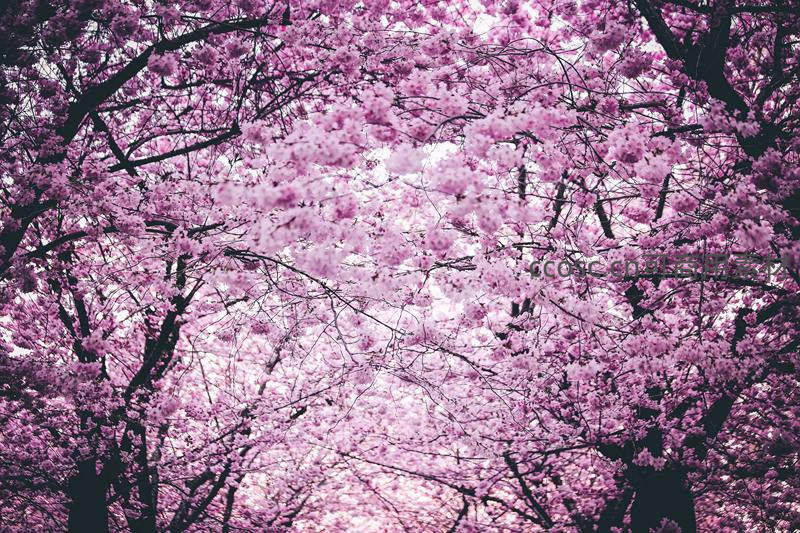 满树樱花从下向上仰拍,粉紫色的花朵密集如云霞般铺满画面,深色枝干穿插其间,构成一幅充满浪漫气息的春日天空画卷。