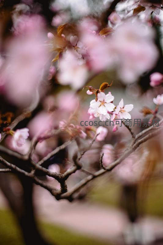 粉樱轻舞枝头,朦胧背景如梦似幻