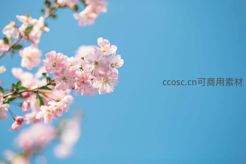 娇嫩的粉色海棠花在纯净的蓝色天空下盛放,花瓣层叠,色彩明丽,传递出浓郁的春日气息与生命力。