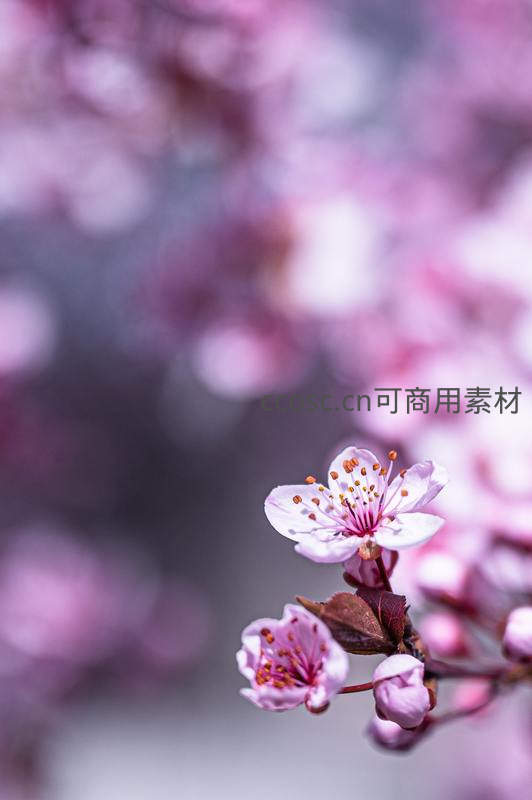 一朵盛开的樱花在梦幻般的紫粉虚化背景中格外醒目,花瓣轻盈,花蕊精致,营造出宁静唯美的春日氛围。