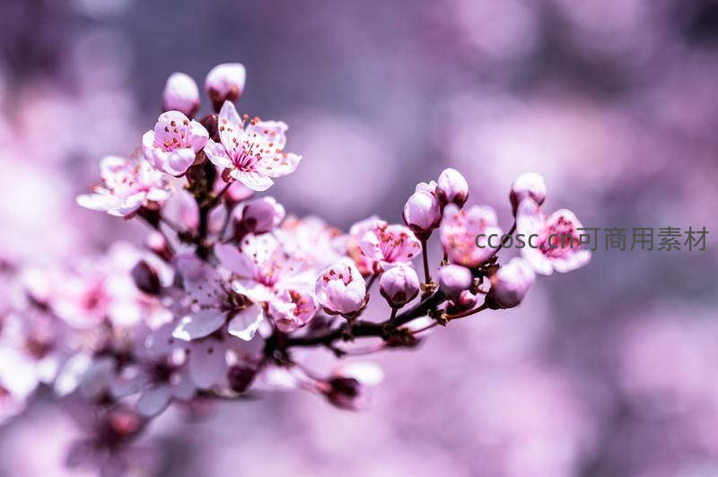 优雅的樱花枝条上,既有盛开的花朵,也有含苞待放的花蕾,粉紫色调柔和,展现生命循环的静谧之美。
