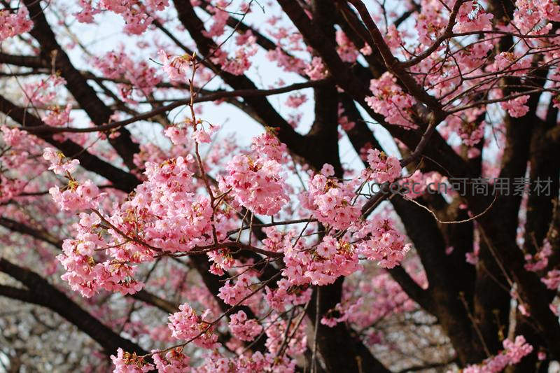 粗壮的深色树枝上缀满了粉红色的樱花,如云似霞,形成强烈的色彩对比,展现出春天旺盛的生命力与壮丽景象。