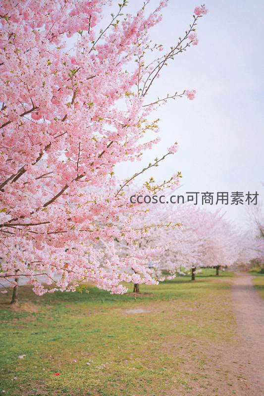 一条蜿蜒的小径穿过繁茂的粉色樱花林,阳光透过花隙洒落,绿草如茵,营造出浪漫而宁静的春日漫步氛围,令人心旷神怡。
