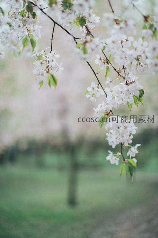 白色的樱花枝条优雅垂下,背景是朦胧的绿色田野,整体画面宁静唯美,如诗如画,尽显春日田园的恬静之美。