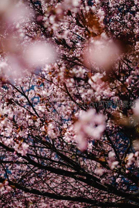 通过前景虚化突出樱花层次感,深色枝干与柔美花瓣形成对比,充满诗意与艺术感。