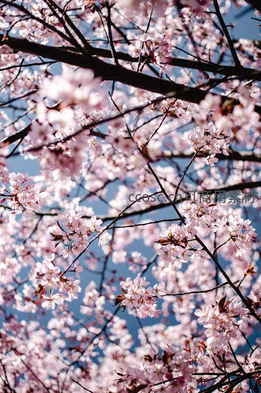 从下往上拍摄,樱花枝条伸向湛蓝天空,光影交错间尽显春日明媚与生命力。
