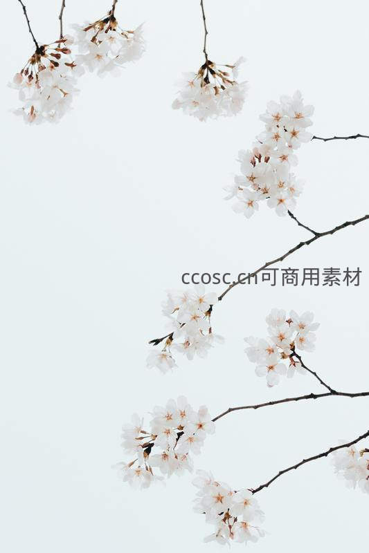 洁白的樱花簇拥在深色枝条上,悬垂于素净背景前,构图简洁,突出花朵的纯净与宁静之美。