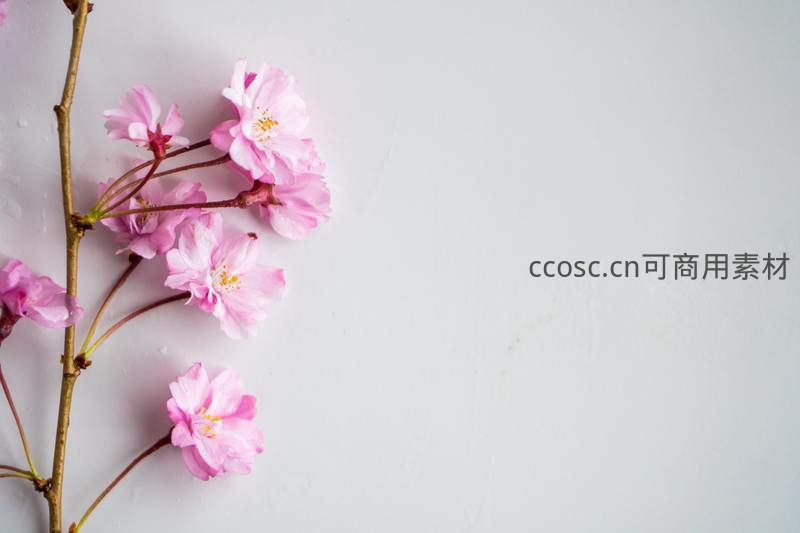 几朵淡粉色樱花轻盈地倚靠在纯白墙面上,构图简洁,色彩柔和,营造出宁静、素雅的日式美学氛围,适合用作装饰或设计素材。