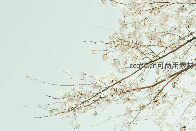 仰拍视角下樱花满枝如雪飘