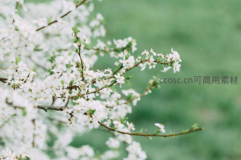 洁白的樱花枝条在翠绿背景的映衬下格外醒目,微风轻拂,花朵随风摇曳,传递出春日田野间清新宁静、万物复苏的气息。