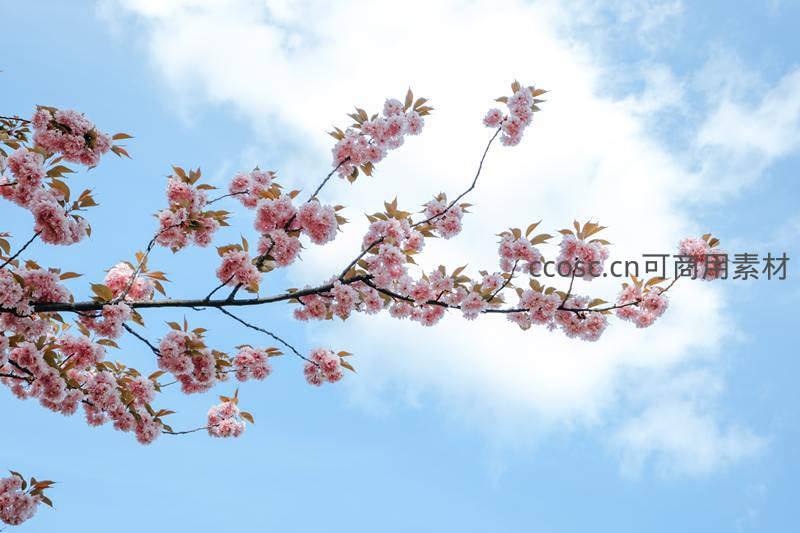 蓝天白云下樱花枝条舒展迎风