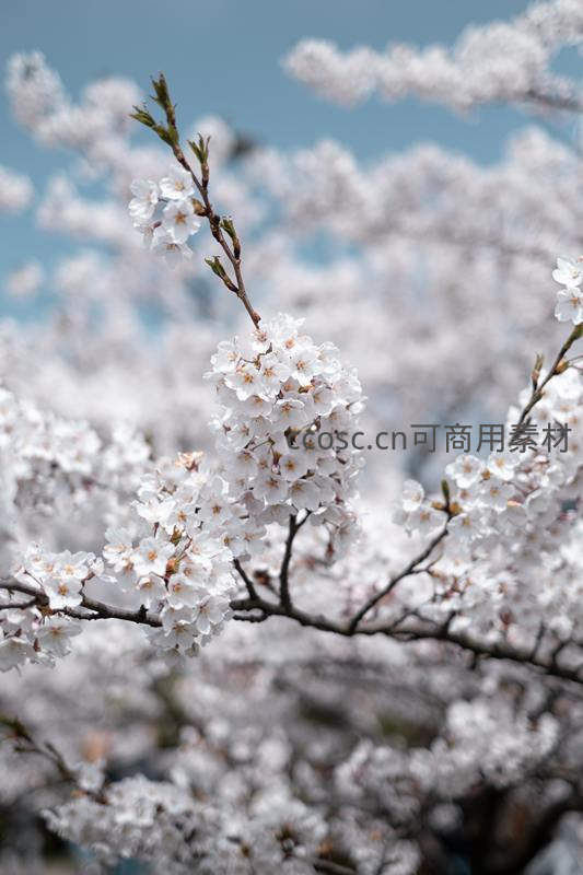 洁白的樱花在晴朗的蓝天下盛放,花瓣层层叠叠,细腻柔美,微风轻拂,仿佛能闻到淡淡的花香,带来宁静与诗意。