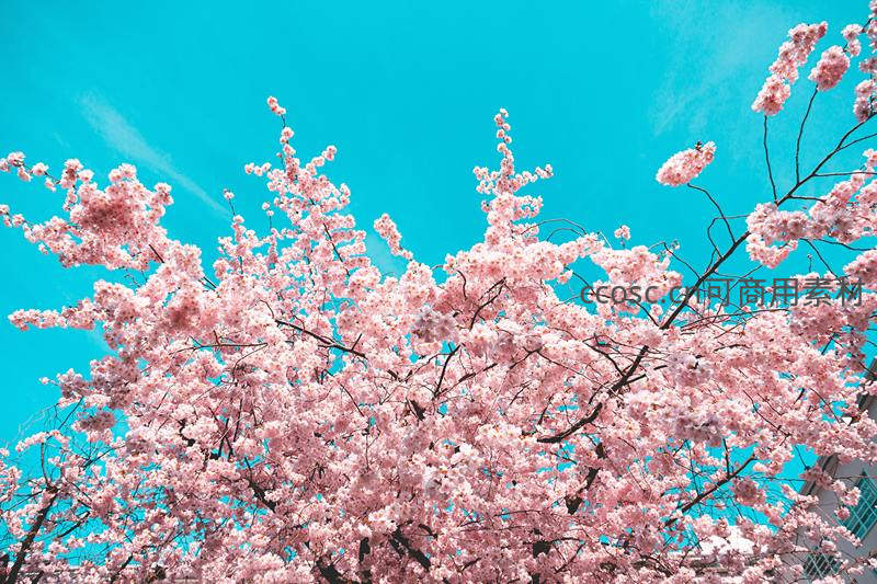 从低角度仰望,整片樱花树冠铺满画面,粉红花浪在碧空下翻涌,仿佛置身于粉色云海之中,尽显春日壮丽景象。