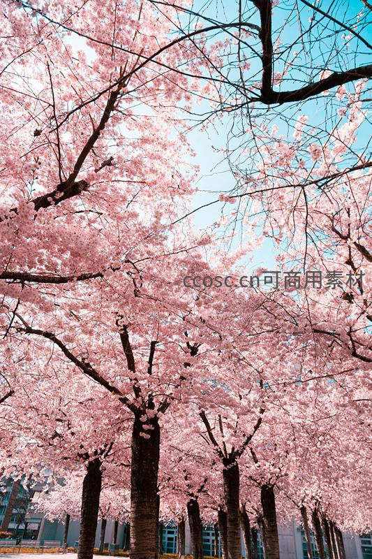 整齐排列的樱花树形成天然花廊,仰拍视角下花枝交错遮蔽天空,行人穿行其间,体验被粉色花海温柔包围的浪漫春日时光。