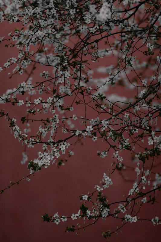 洁白的花朵在深红色背景墙前绽放,形成强烈视觉对比,古典建筑与自然春景交融,营造出浓郁东方韵味和诗意氛围。