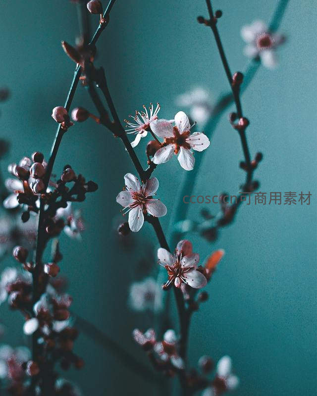 深青色背景下,几朵初绽的樱花细节清晰可见,花瓣娇嫩、花蕊纤细,展现生命初绽时的细腻与柔美。