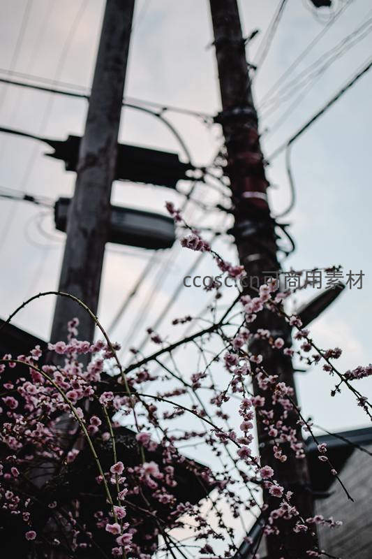 粉嫩的梅花在老旧电线杆旁肆意开放,粗犷的工业线条与柔美的花朵形成强烈视觉冲击,记录下城市角落里顽强的生命力。