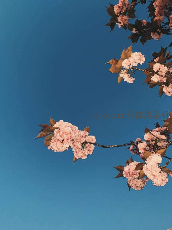 粉嫩的樱花在湛蓝天空下绽放,枝头花朵繁茂,绿叶点缀其间,展现出春日生机勃勃的自然美景。