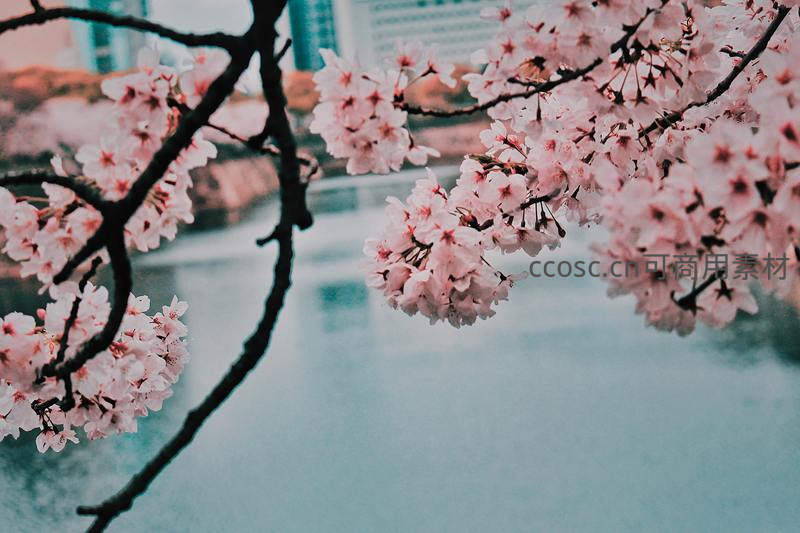 河畔樱花如云,城市倒影朦胧