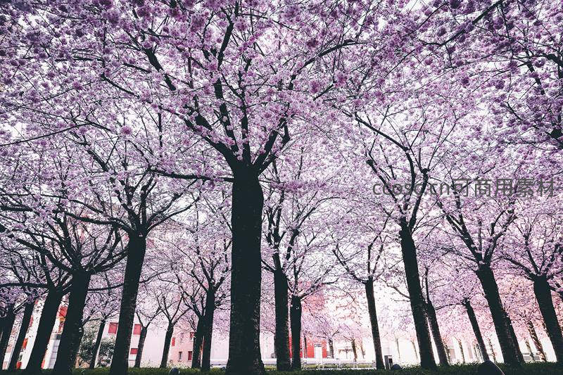 整齐排列的樱花树形成一条梦幻般的花廊,粉紫色花朵覆盖枝头,阳光透过缝隙洒落,地面隐约可见行人,营造宁静浪漫的春日漫步氛围。