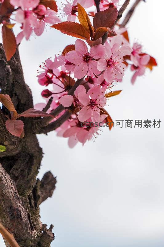 镜头聚焦于樱花树梢,粉嫩的花朵与红褐色新叶相映成趣,粗糙的树皮纹理清晰可见,展现春日生机。