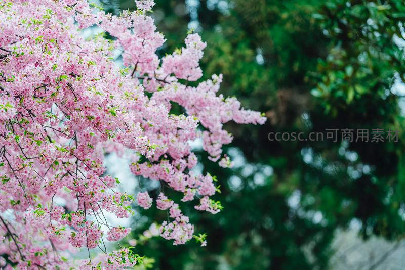 粉嫩的樱花在枝头盛开,花瓣层层叠叠,背景绿意朦胧,展现春日生机与温柔诗意。