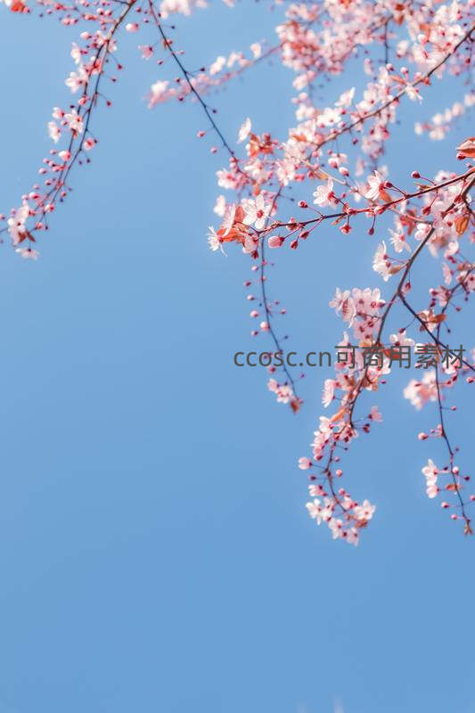 鲜红与粉白交织的樱花在湛蓝天空下盛开,枝条斜伸,花瓣轻盈,展现春日最明媚灿烂的生命力与视觉美感。